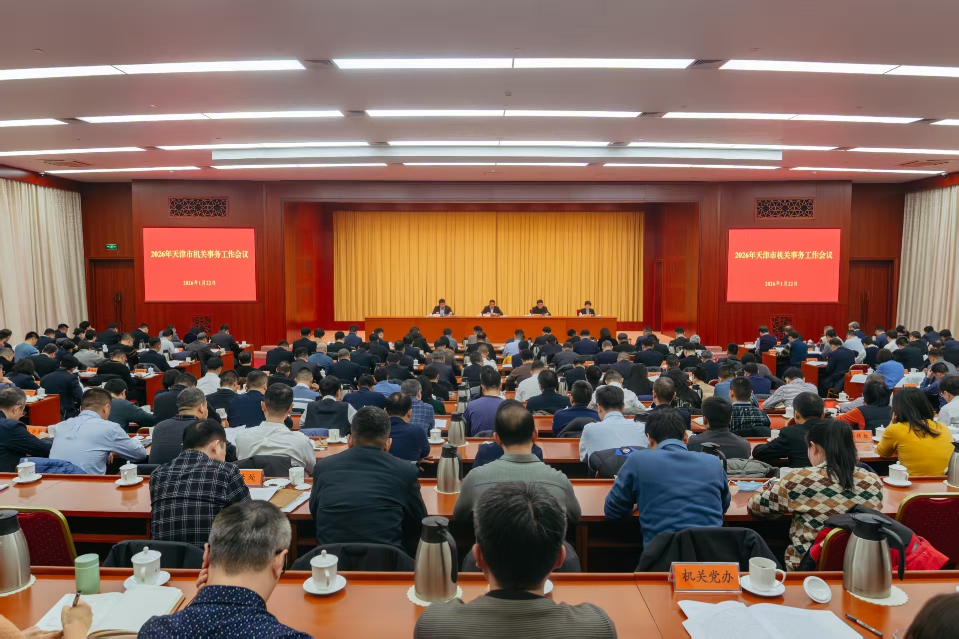 近日,2026年全市机关事务工作会议在天津礼堂召开。会议以习近平新时代中国特色社会主义思想为指导,深入贯彻党的二十届四中全会精神,贯彻落实习近平总书记视察天津重要讲话精神和关于机关事务工作的重要指示精神,传达全国机关事务工作会议精神,总结2025年工作情况,谋划部署2026年和“十五五”时期工作。市机关事务管理局党组书记、局长王旭东出席并讲话。局党组成员、副局长李嘉麟、高洪升、李莉,二级巡视员高洁出席会议。
