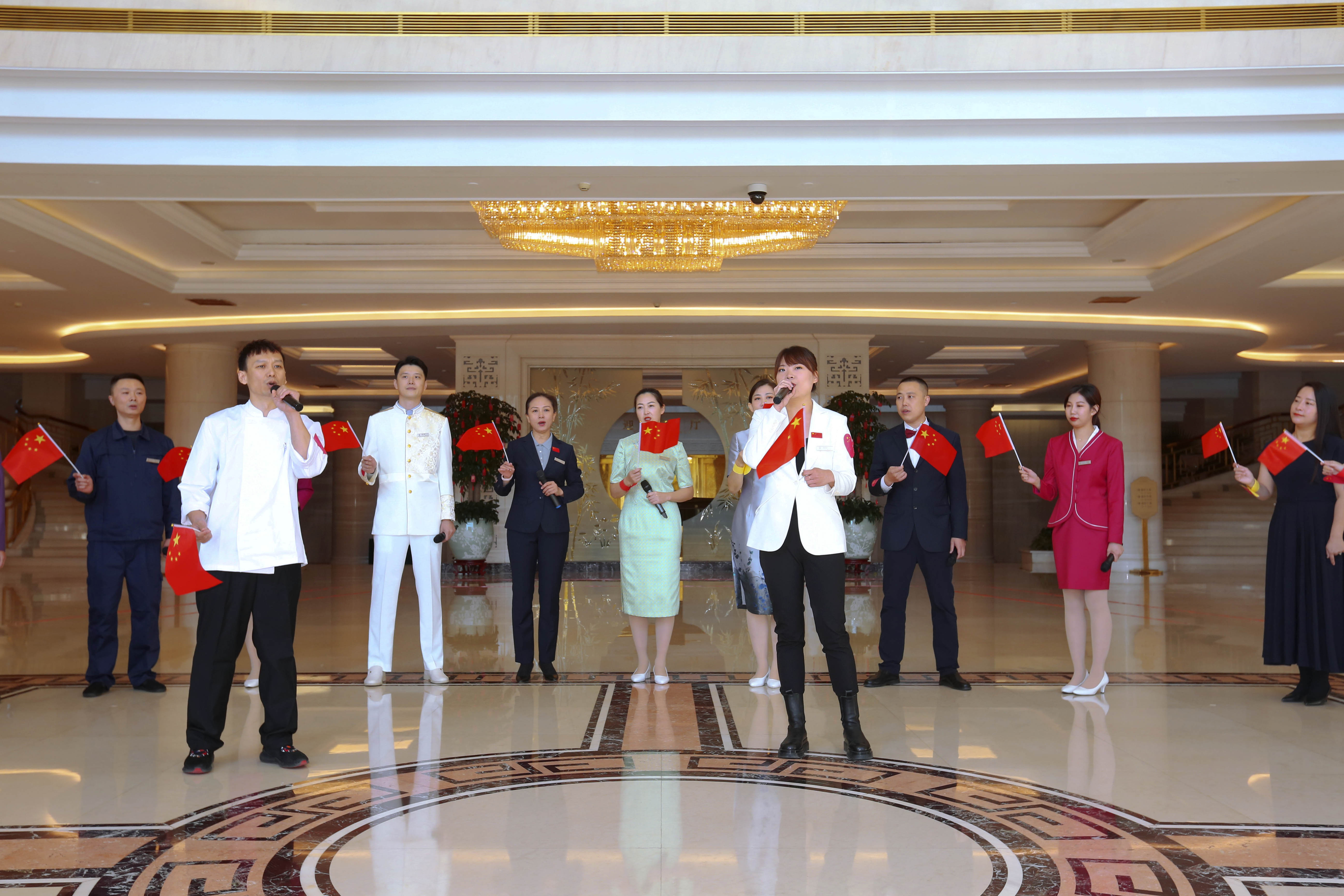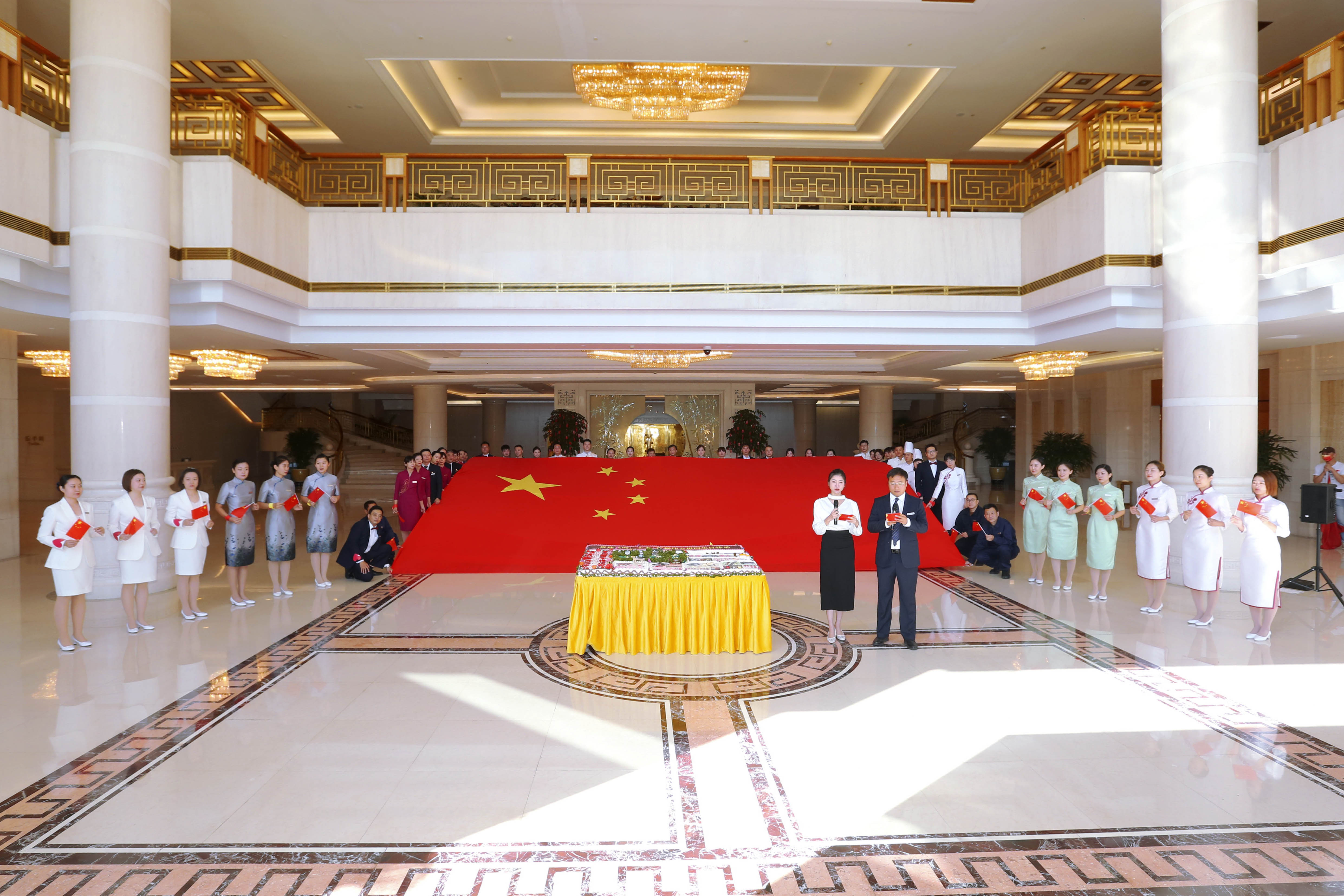活动在钢琴演奏的《我和我的祖国》乐曲中拉开帷幕,9名主唱和部分身着不同样式工服的员工挥舞着国旗从四面八方走来,用歌声表达对祖国的真挚热爱和美好祝福。迎宾馆领导班子成员带领干部职工将写满心愿的祝福卡挂上许愿树,青年党员团员代表即兴演唱《红旗飘飘》,在一片歌声中,“喜迎党的二十大祝福伟大祖国生日快乐”创意蛋糕缓缓推出,宾馆风貌、奋进标语、部门亮点、服务保障元素纷纷映入眼帘,寓意在党的坚强领导下,全馆上下团结一致共同绘就跨越发展的美好蓝图,共同踏上伟大祖国新的壮丽航程。随后,一面巨型国旗在大厅中央迅速展开,将整场活动推向高潮。
